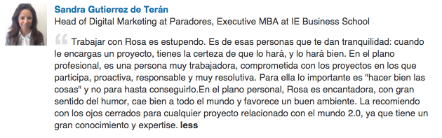 Mis clientes saben que para mí lo más importante no es el fee pactado, ni «las horas» definidas en el contrato. Mi nivel de compromiso con cada uno de ellos va más allá… Lo importante es hacer bien las cosas y cuando trabajas en el mundo online y más concretamente en el área del Social Media, comprendes que la red no entiende ni de horarios ni de límites, ya que la atención termina convirtiéndose en 24×7 si el objetivo es prestar un buen servicio a mis clientes. Esta es mi filosofía y así trabajo.